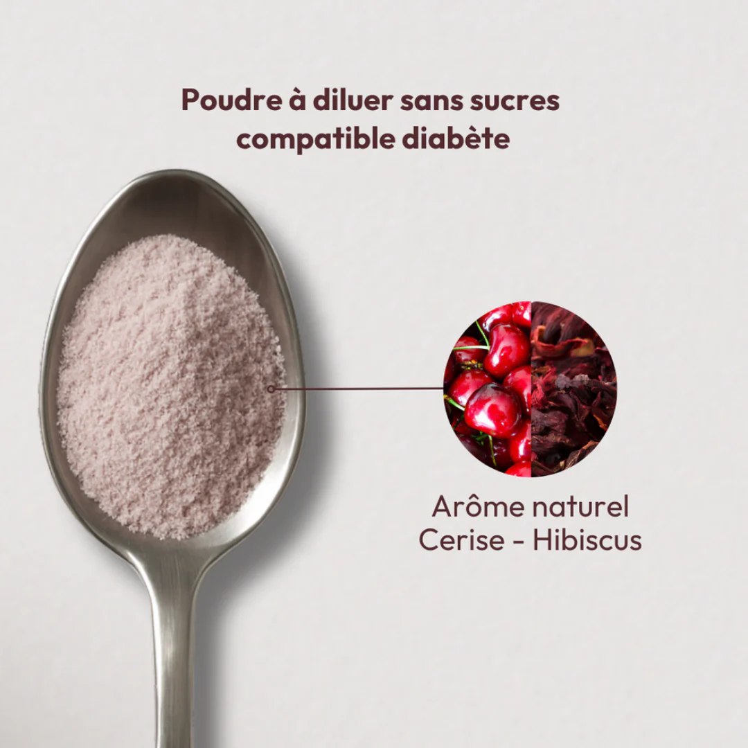 Poudre fine à diluer, sans gluten, au goût naturel de cerise/hibiscus. [MY] Essentiels Activateur de Métabolisme de MiYé se consomme dans de l’eau, une compote ou un yaourt. Compatible avec le diabète.